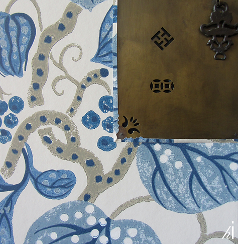 Restyling of two oriental cabinet doors with découpage of William Yeoward wallpaper. The garniture of the door locks and hinges were made to measure with the same wallpaper. Finished with matt lacquer.