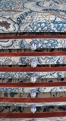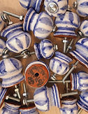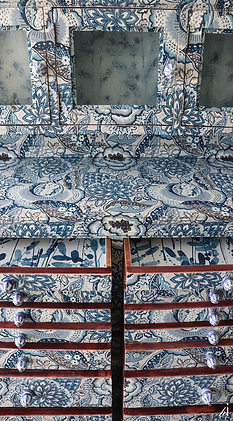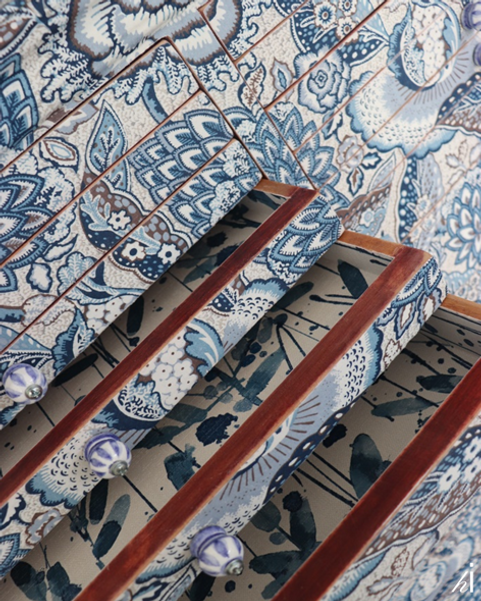 Restyling of an antique apothecary wood cabinet with fabric découpage on exteriors finished with matte lacquer, wallpaper découpage from Scott Living Home on interiors, new top and new bespoke ceramic knobs, form Porches Pottery handpainted. All handmade.