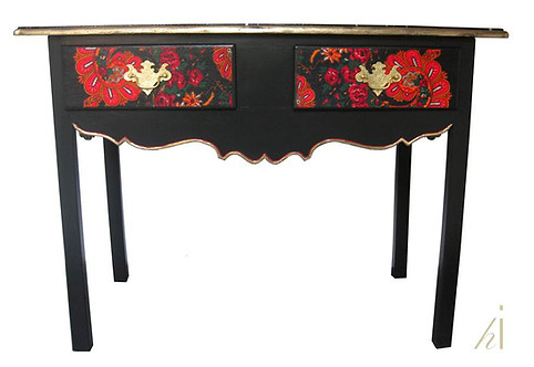 Restyling of a antique wood table with decorative painting of black marble on top, matte black paint on structure, découpage of typical portuguese wool scarf on drawers and sides, light distressed gold leaf on red painting and protective lacquer as finishing. All handmade.